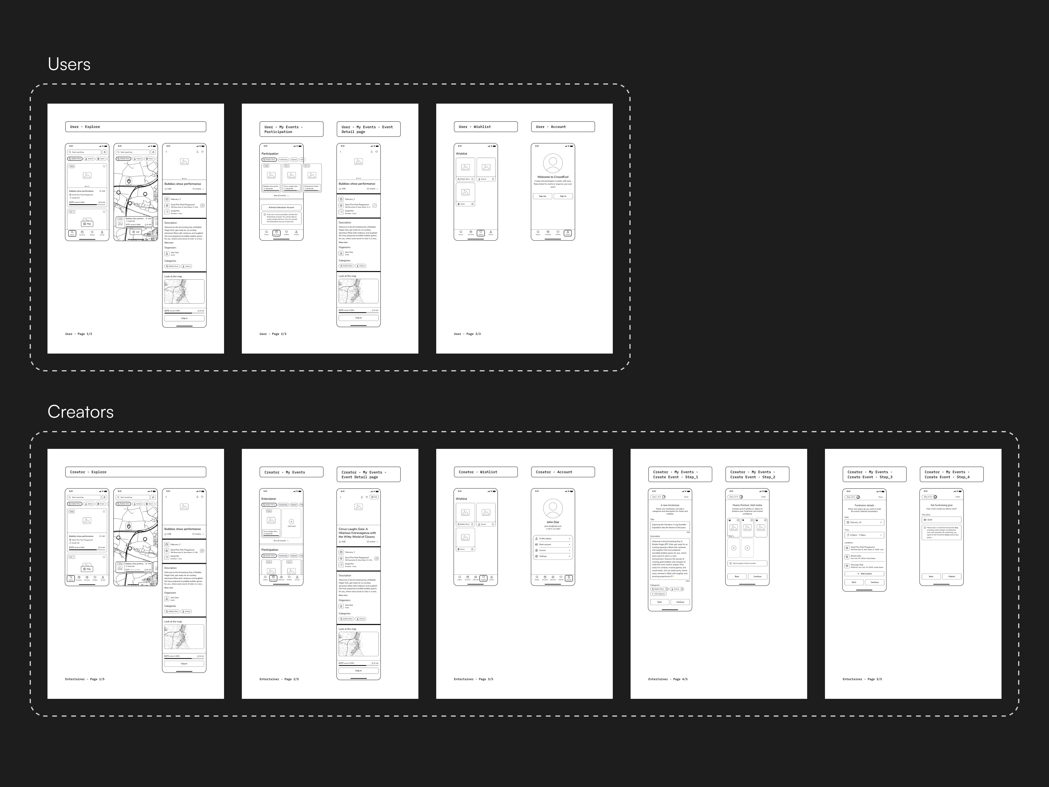 Creating wireframes for a US patent application with basic functionality for two types of users: "Users" who participate in fundraising for event realization, and "Creators" who collect funds to carry out their shows.